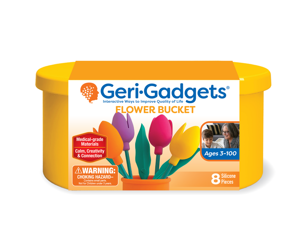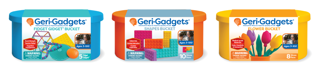 Each set comes in a color-coded silicone bucket with a lid that doubles as part of the engagement. Perfect for dementia care, rehabilitation, special education, and intergenerational fun, Geri-Gadgets® encourage tactile exploration, creativity, and hands-on interaction. Every bucket offers hours of activity, supports focus and dexterity, and gives caregivers peace of mind with tools that are non-toxic, lab-tested, and built to last.