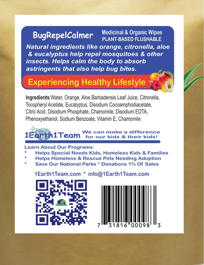 Medicinal Wipes, BugRepelCalmer, 1Earth, Case of 6 Packs of 16 (96 Wipes)