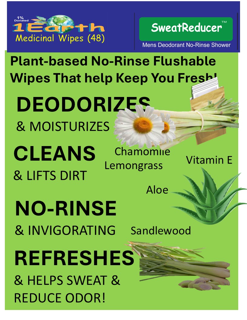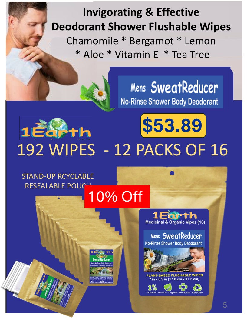 Medicinal Wipes, Mens SweatReducer, 1Earth, Case of 6 Packs of 16 (96 Wipes)